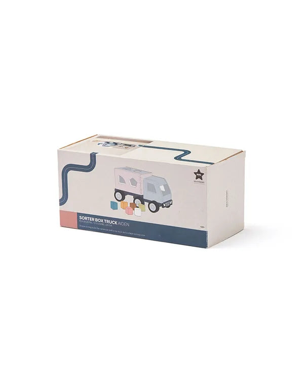 A truck that serves as a toy truck and a cube that allows you to fit shapes together. The truck comes with six blocks of different shapes and colors.