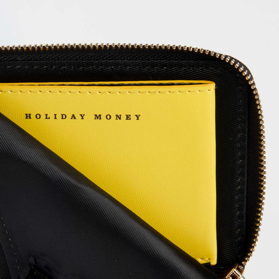 Bolso central interior em cor contrastante com serigrafia com o texto “holiday money”.