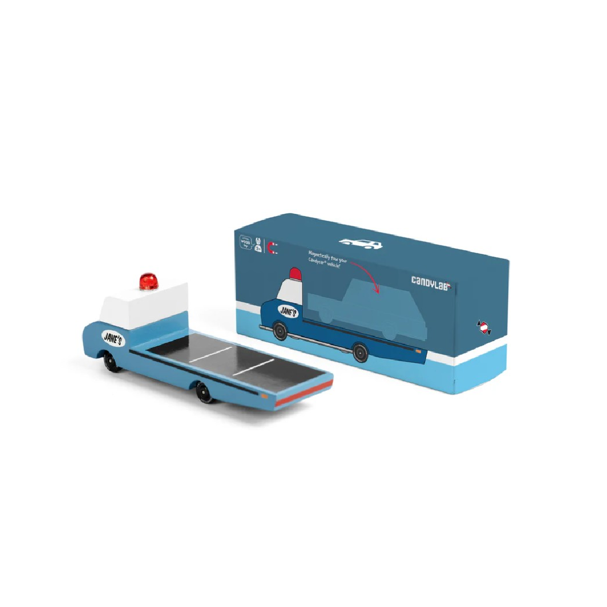 Independentemente da localização ou das dificuldades, a Jane's Tow Truck está aqui para levar os seus carros para onde eles precisam estar. Com uma grande plataforma magnética e uma luz de teto chamativa, este camião é o complemento perfeito para qualquer coleção.