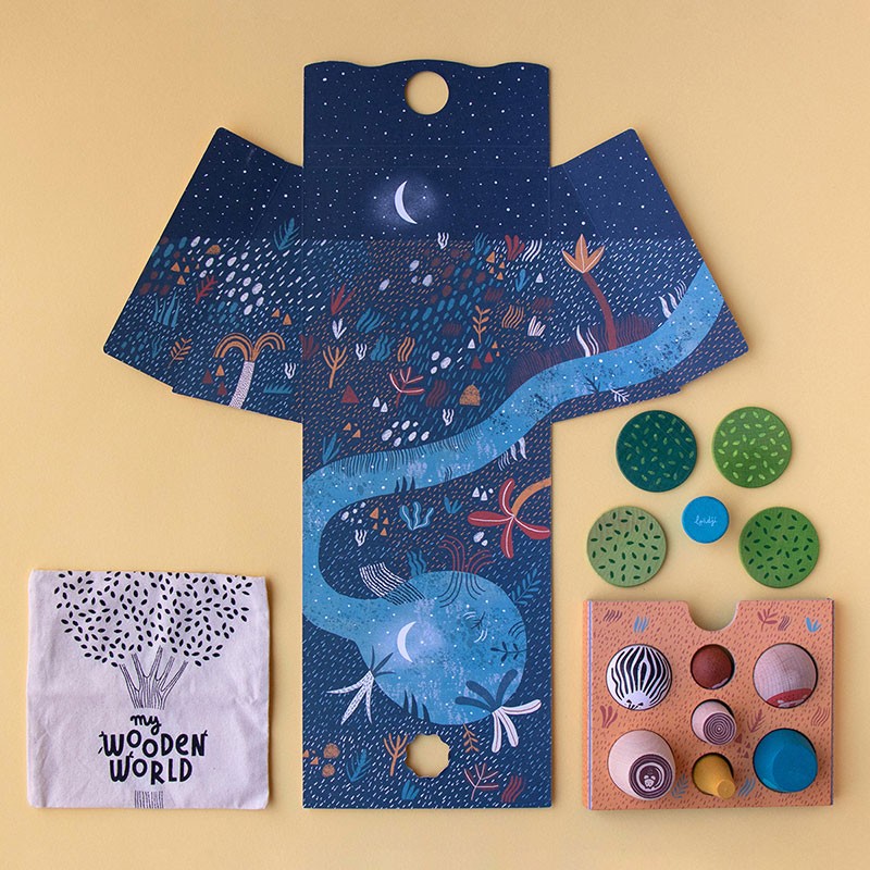 Wooden toys that stimulate the creativity of children. The smaller figures can be hidden under the larger ones, increasing the possibilities of play. One by one, the figures can be stacked on top of each other, allowing not only symbolic and free play, but also a game of construction and balance. The cardboard box can be used as a setting for countless adventures.