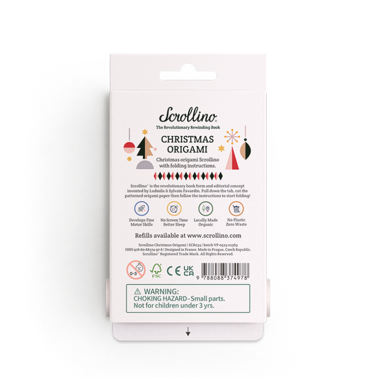 O Scrollino, com um design elegante, oferece mais de 1,80 m de papel origami com motivos natalinos.