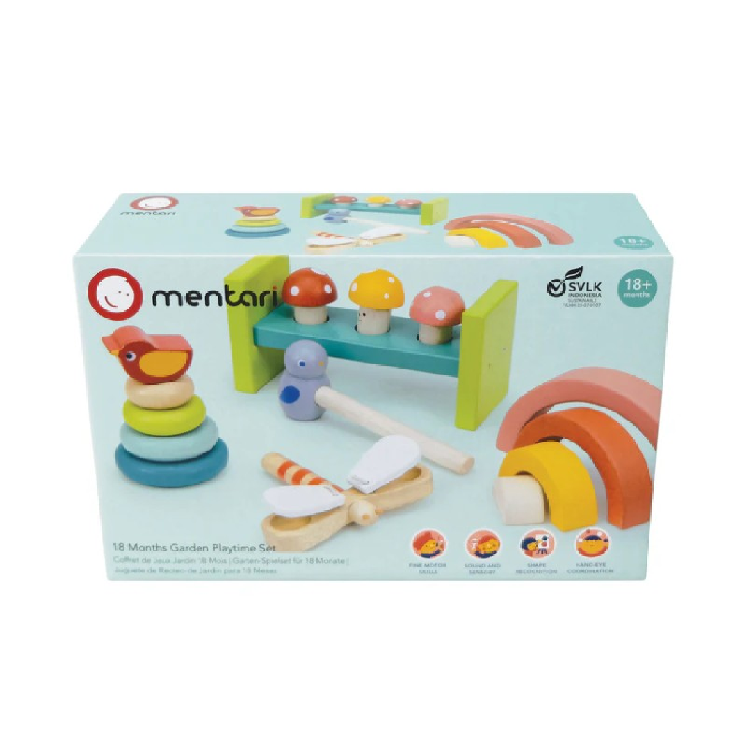 Esta caixa de brinquedos contém 4 brinquedos divertidos para a aprendizagem e é um presente maravilhoso. Árvore empilhável de 5 peças com pássaro, que requer a colocação dos anéis para ser empilhada. Túnel arco-íris empilhável de 4 peças, que pode ser colocado de várias maneiras como parte de uma brincadeira aberta. Jogo de martelo com cogumelo de 3 peças que introduz a causa e o efeito, e um chocalho de libélula. Motricidade fina, sensorial, empilhamento e ordenação, com causa e efeito.