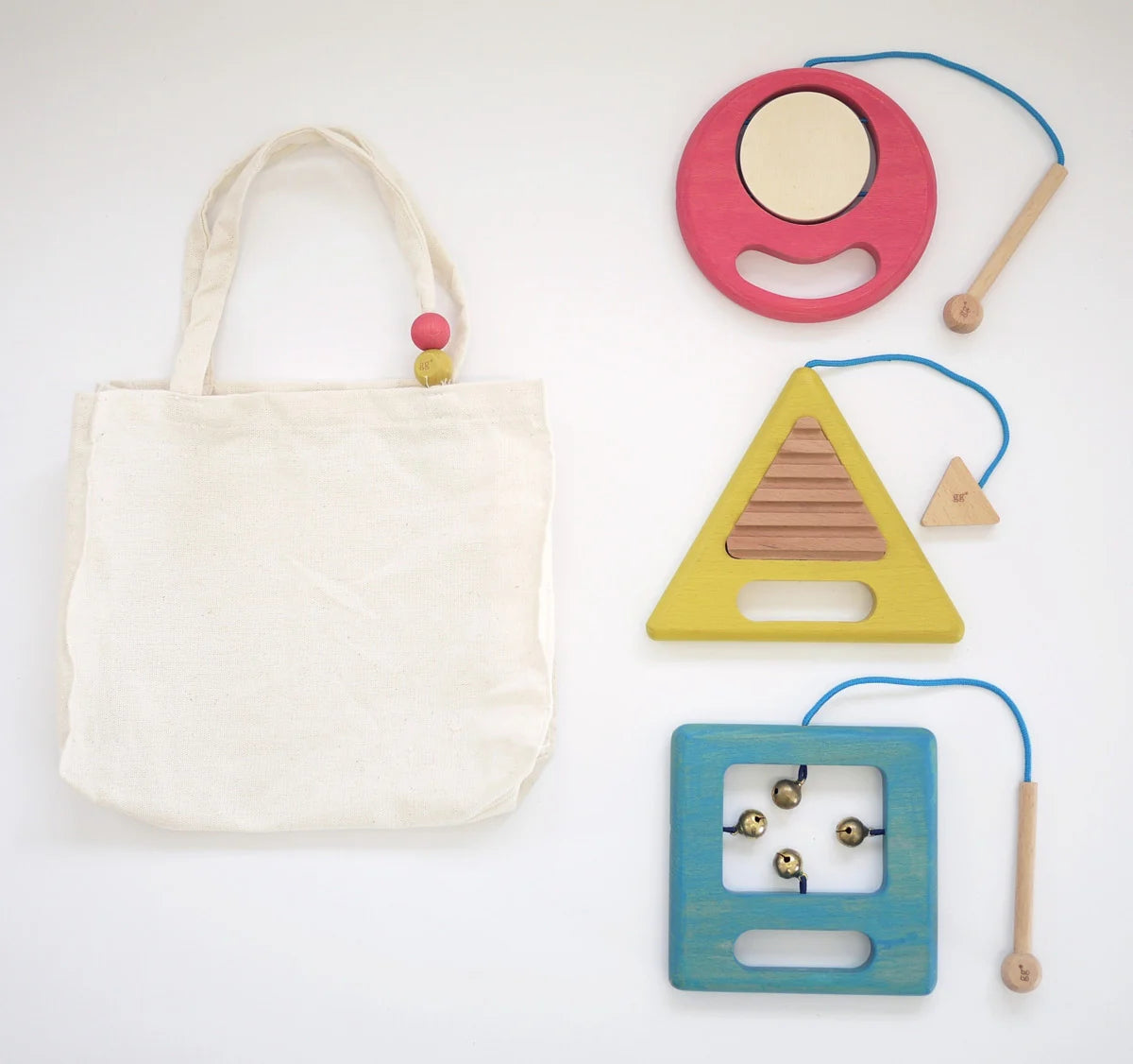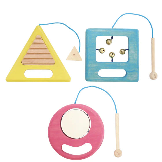 Three different sounds for hours of exploration! Each set consists of a circular drum, a triangle that makes a crow-like sound, and a square with bells that produce different sounds.
