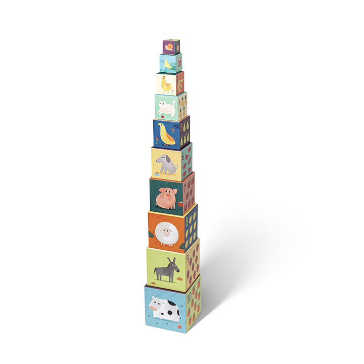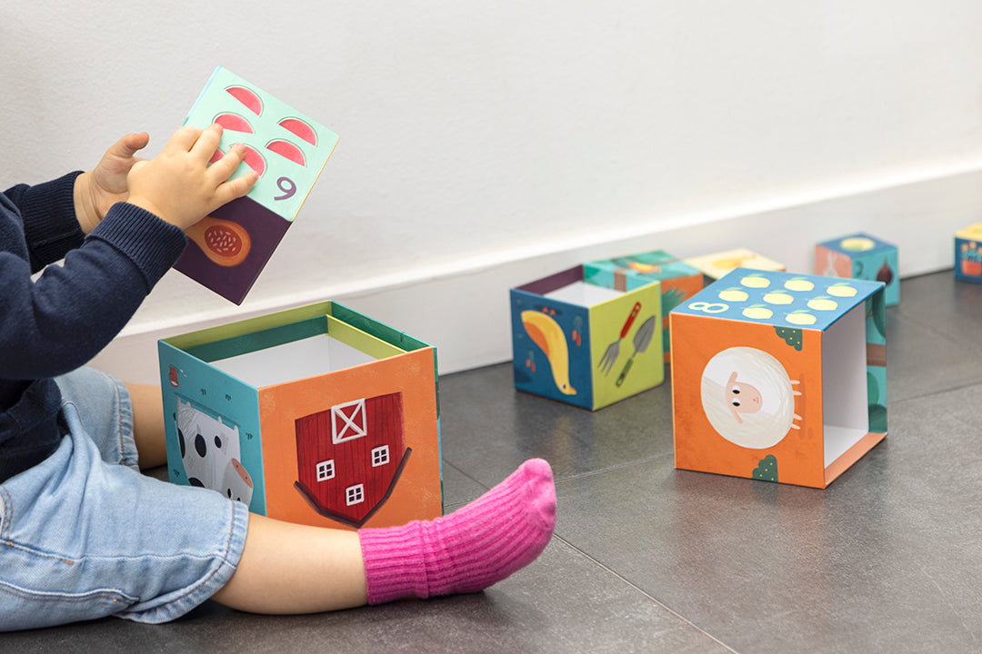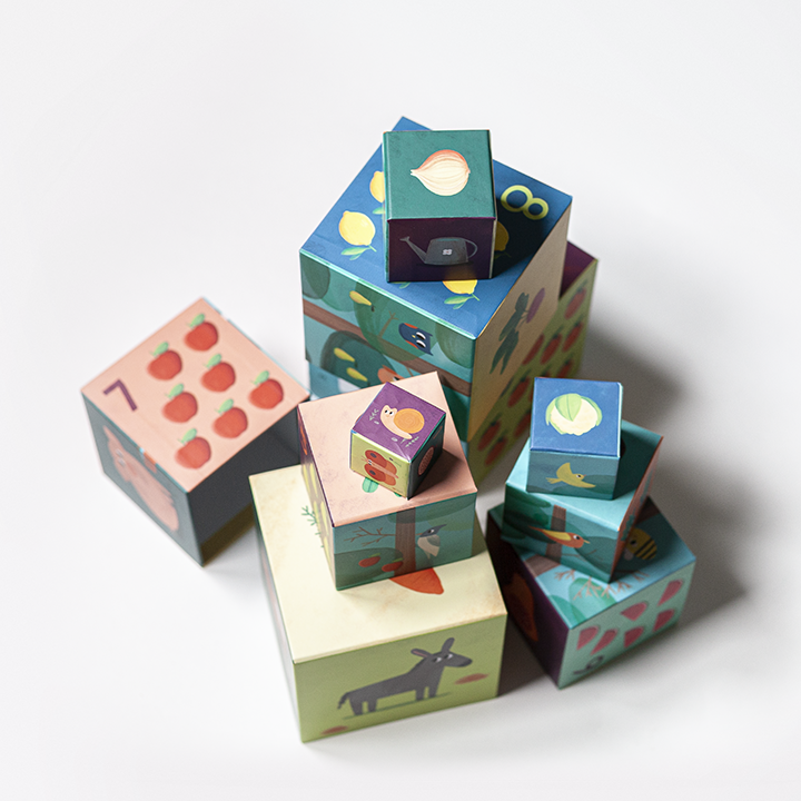 Empilhar e encaixar são duas das mais importantes competências do desenvolvimento infantil. Por isso, os cubos de empilhar continuam a ser um dos brinquedos mais presente e utilizado a partir dos 12 meses. Ao tema da quinta, juntámos uma ilustração com um toque vintage, e um sem número de imagens para nomear e observar. Desde frutas e vegetais, passando por animais ou objetos, há muito para explorar.