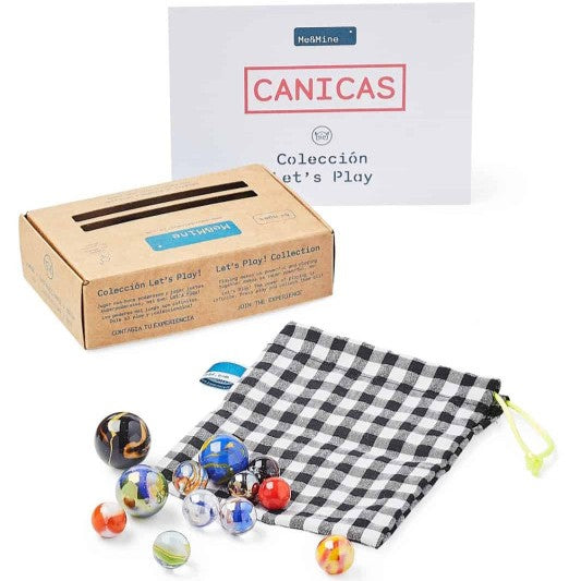 Conjunto de berlindes que contém 20 berlindes de diferentes tamanhos e cores, inclui um saco de tecido e instruções para alguns jogos de berlindes clássicos.