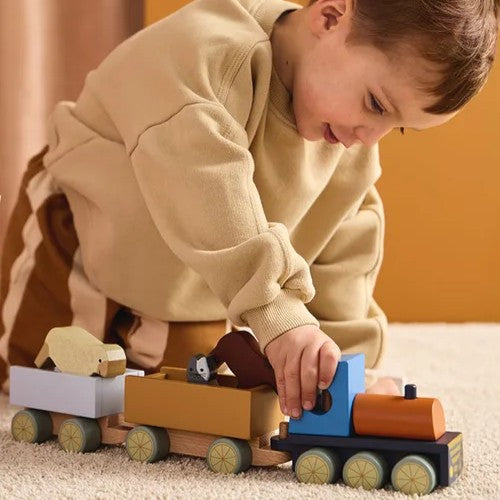As crianças podem colocar os animais nos vagões e criar as suas próprias histórias enquanto empurram o comboio. Os animais podem ser movidos e dispostos de diferentes maneiras, oferecendo inúmeras possibilidades de brincadeira. O comboio também inclui três blocos de madeira empilháveis para diversão adicional com classificação, empilhamento e equilíbrio.