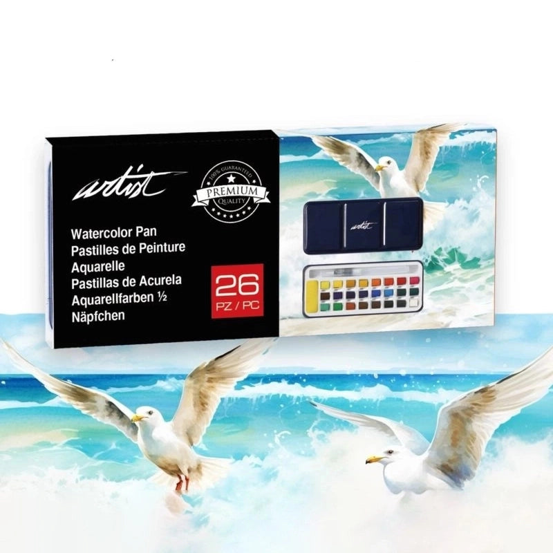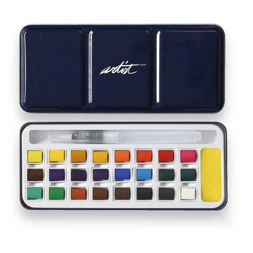 Contém: Estojo metálico com tampa que pode ser utilizado como paleta. Tem 3 grandes espaços que servem de poços de mistura; 1 pincel com reservatório de água; 1 esponja; 24 pastilhas de aguarela de cores variadas.