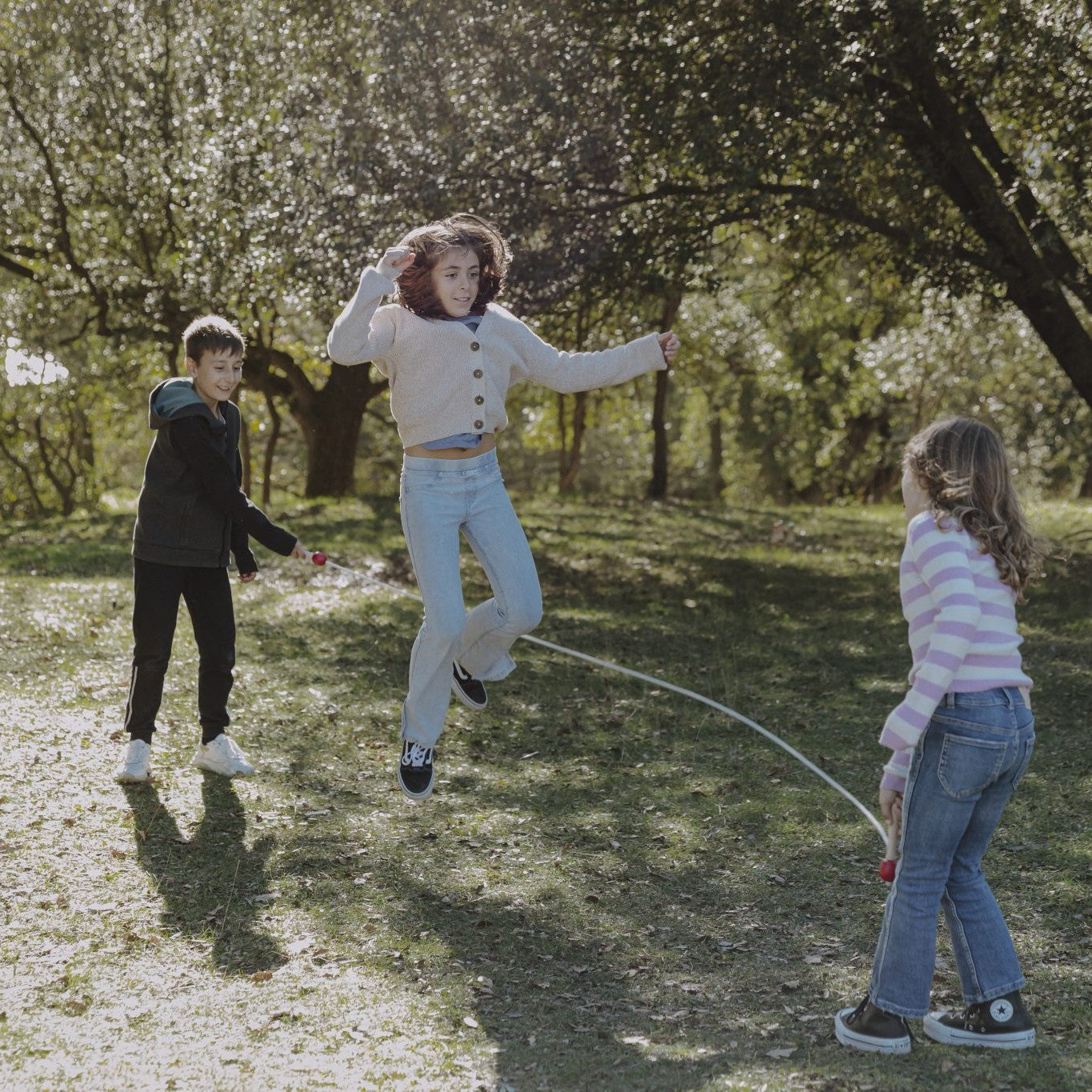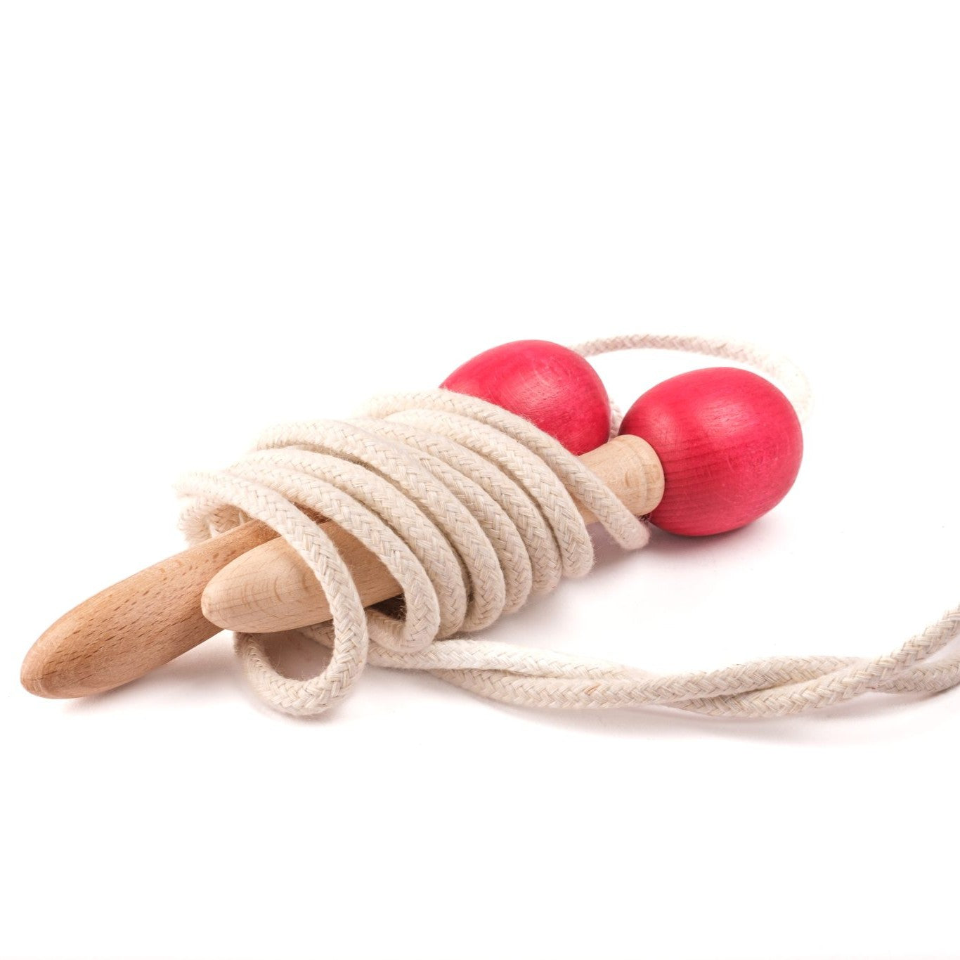 Corda de saltar com cabo de madeira em cores naturais e vermelhas. Disponível em dois tamanhos diferentes de corda de algodão: 2 ou 4 metros, consoante os jogadores que queiram participar. A corda tem o peso perfeito para saltar corretamente.