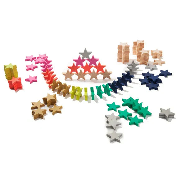 O céu é o limite com este dominó de 100 peças de madeira coloridas em forma de estrela, concebidas para uma brincadeira aberta e inspirada em Montessori.