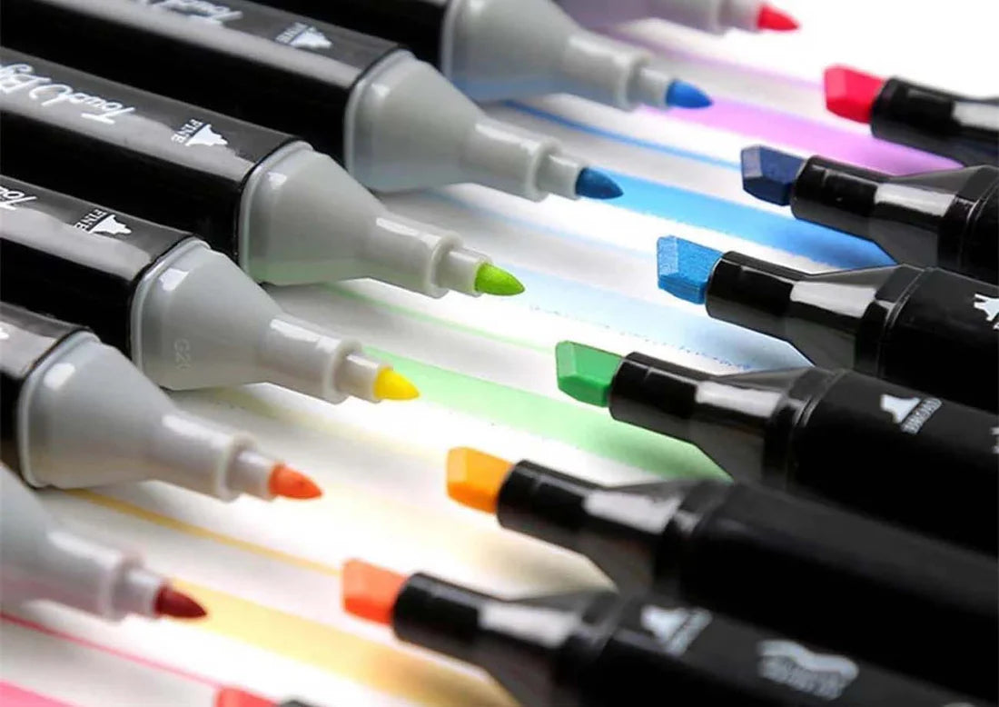 Estojo com 30 canetas de feltro de ponta dupla, com tintas à base de álcool de desempenho superior.