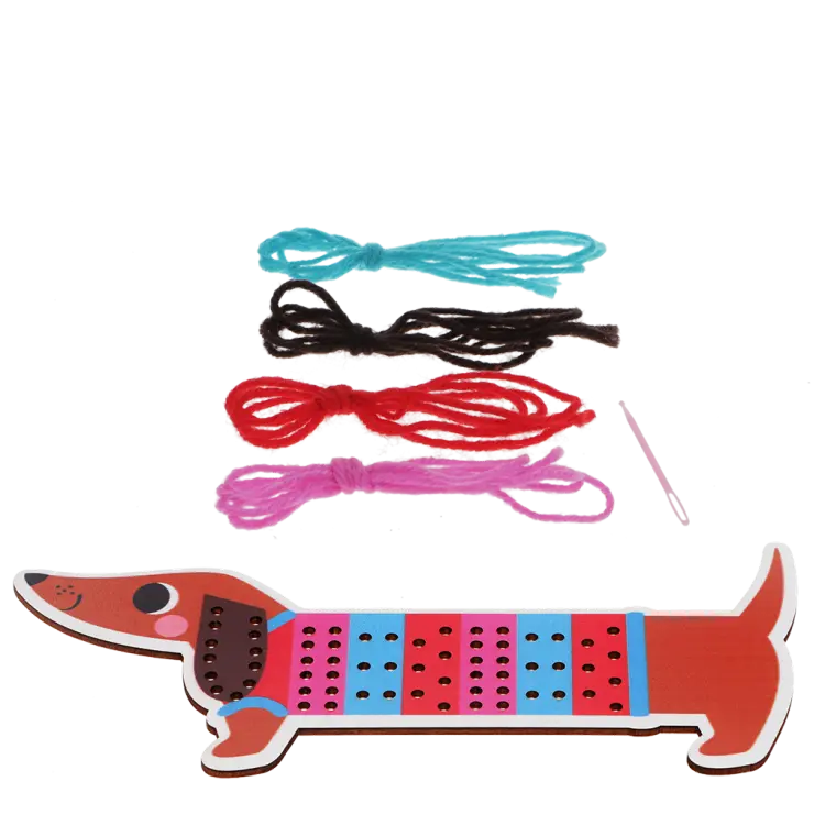 O conjunto inclui: Tábua de costura em madeira com a forma de um cão salsicha;