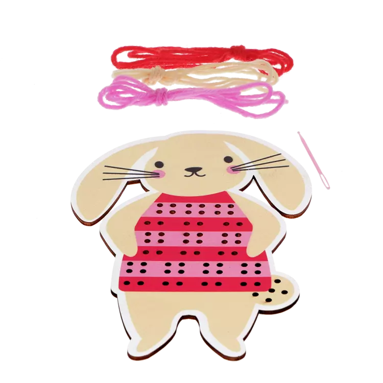 O conjunto inclui: Tábua de costura em madeira com a forma de um coelho;