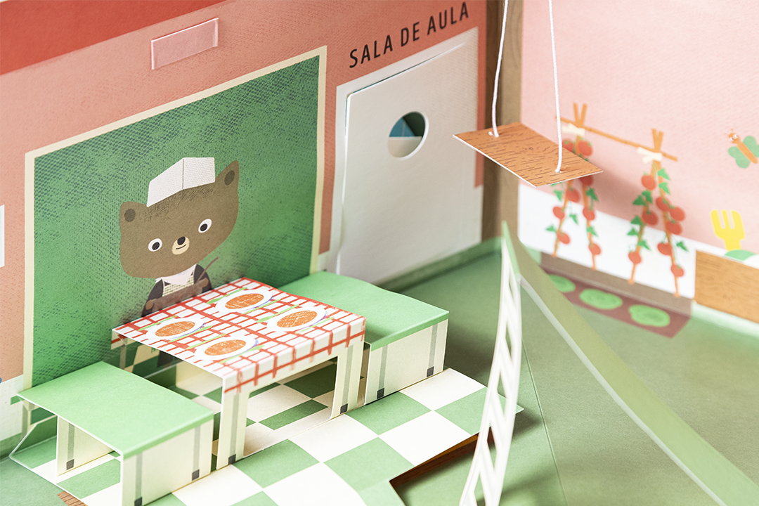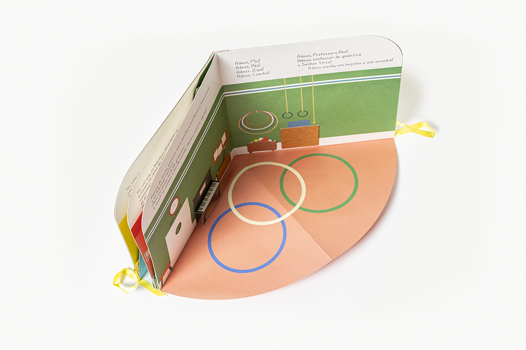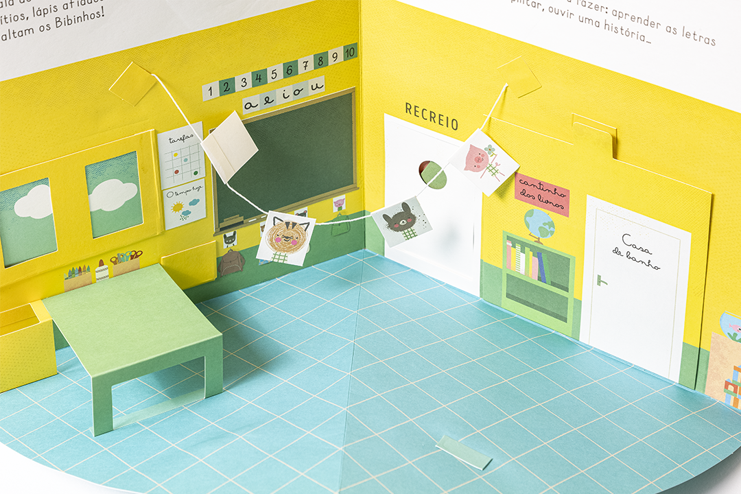 Livro-jogo desdobrável. Vamos à escola com os Bibinhos? Neste livro muito especial, vivemos cada momento de um dia na escola, a brincar, dentro de cada cenário. Vamos aprender a lição na sala de aula com a Professora Ana, brincar no recreio, almoçar no refeitório do Senhor Urso e fazer alongamentos no espaldar do ginásio!