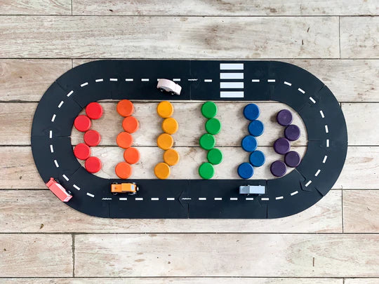 Este conjunto compacto de 16 peças (8 curvas, 6 rectas, 2 intersecções) é perfeito para as crianças explorarem o mundo das estradas. Feitas de material flexível e durável, estas peças são perfeitas para brincar em qualquer sítio - desde o chão da sala de estar até ao quintal.