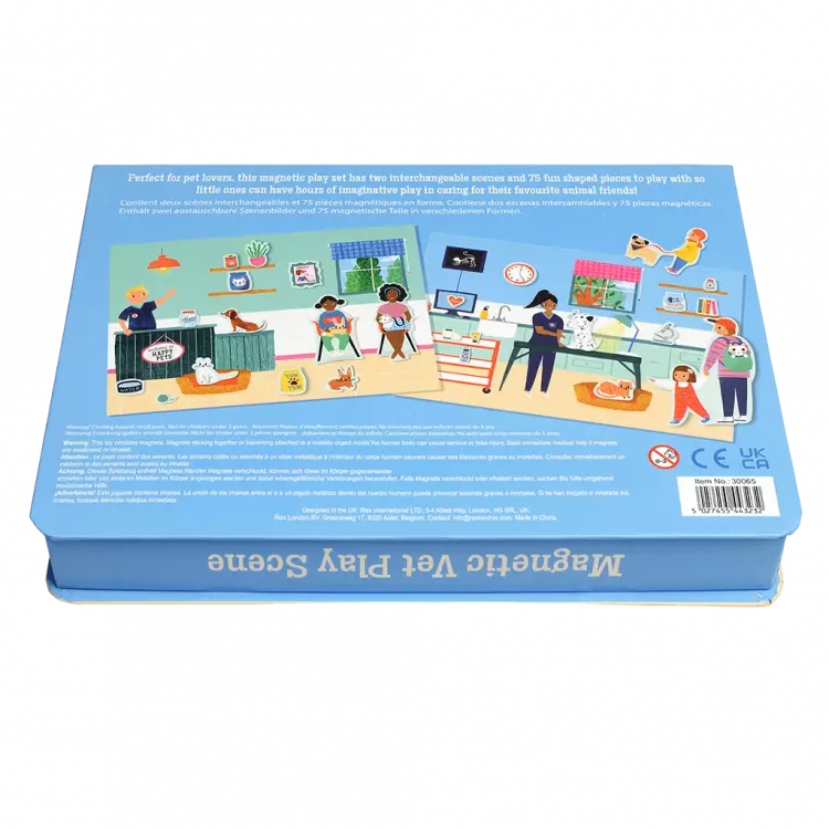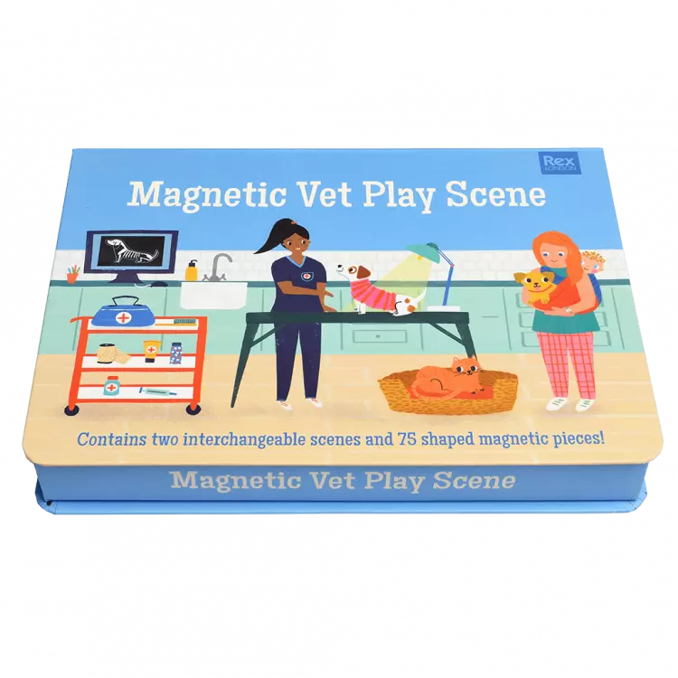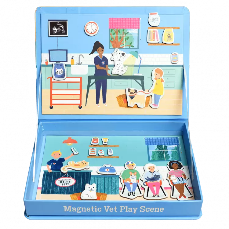 Este doce conjunto de jogos magnéticos apresenta dois cenários veterinários intercambiáveis e 75 peças, incluindo animais de estimação, pessoas e equipamento veterinário.